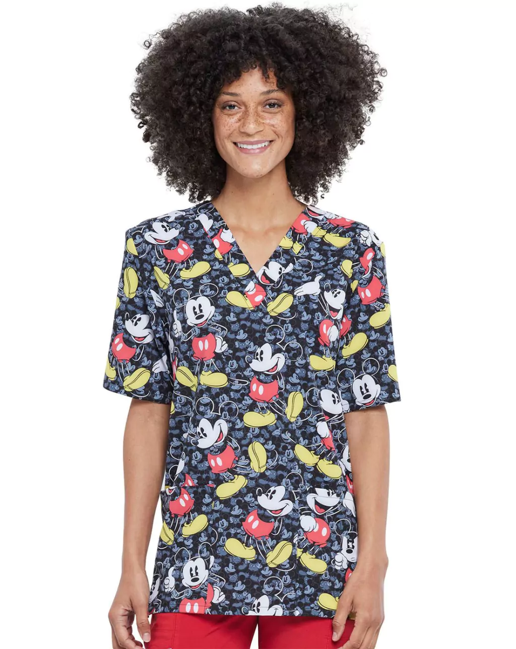 Esta filipina unisex con cuello en V tiene dos bolsillos delanteros de parche y aberturas laterales para facilitar el movimiento.