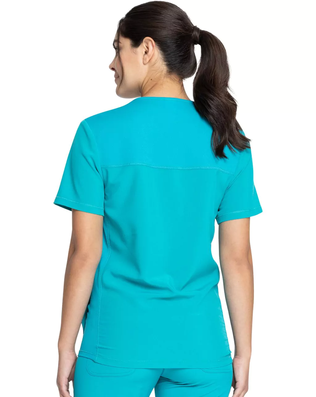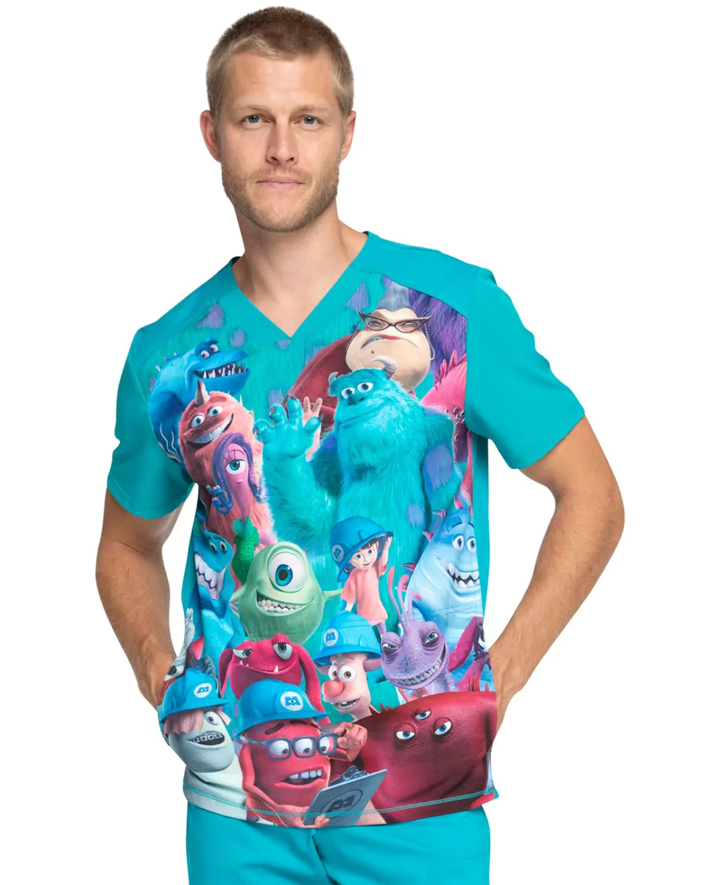 Esta filipina estampada con cuello en V de ajuste unisex tiene malla de punto en el escote, el canesú y los paneles laterales. La parte superior también presenta costuras de yugo delanteras y traseras. Otras características incluyen un bolsillo canguro en la costura para almacenamiento
