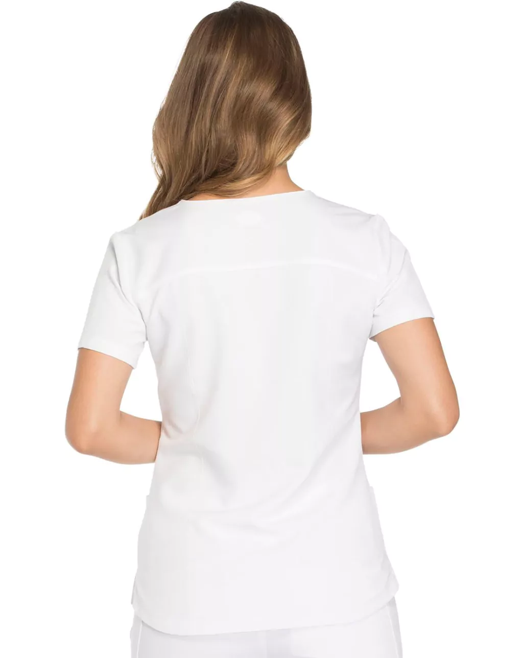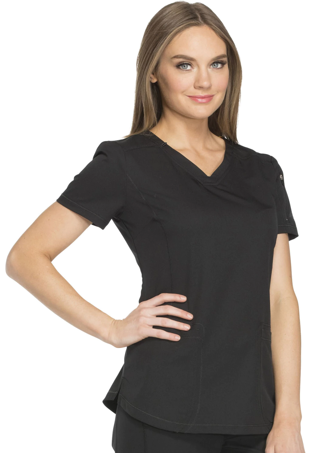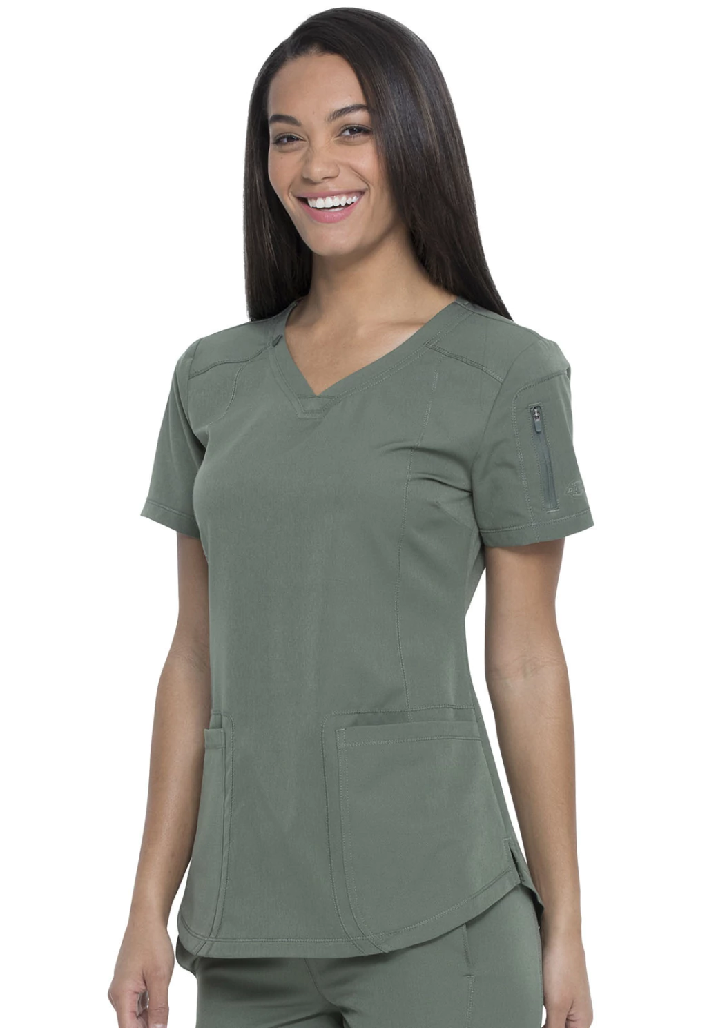 Filipina medica con cuello en V, de corte contemporáneo presenta canesú en la parte delantera y trasera, detalle de costura princesa en la parte delantera y bolsillos de parche delanteros redondeados (el derecho con una salida de enrutamiento de cables a tono en el interior). También se presenta un bolsillo en la manga con cierre de cremallera con transferencia de calor del logotipo tonal, aberturas laterales, un dobladillo de camisa y detalles de pespuntes en todas partes.